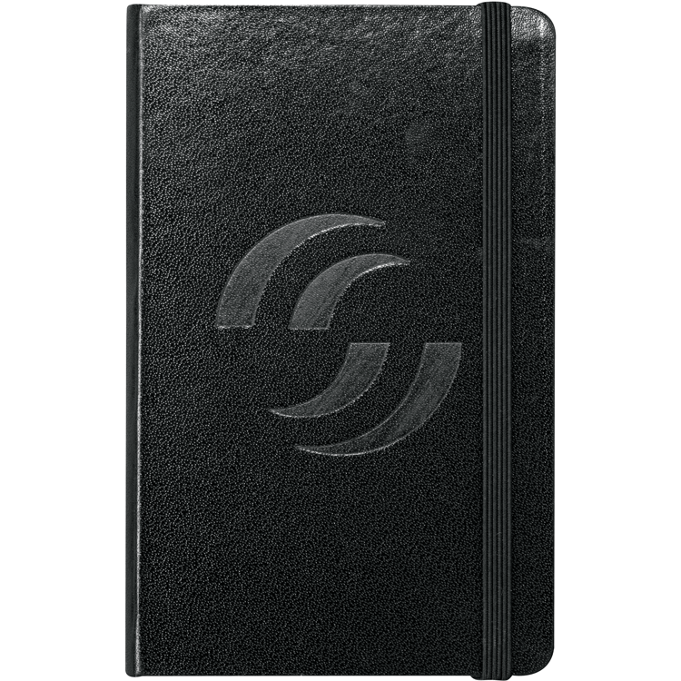 Built-in elastic closure and ribbon page marker. Expandable accordion pocket inside the back cover. Includes 80 sheets of ruled paper. Measures 5 1/8" x 3 1/2" x 1/2". Available in black and navy. This item can be debossed, with a minimum order of 144. Call us for details!
