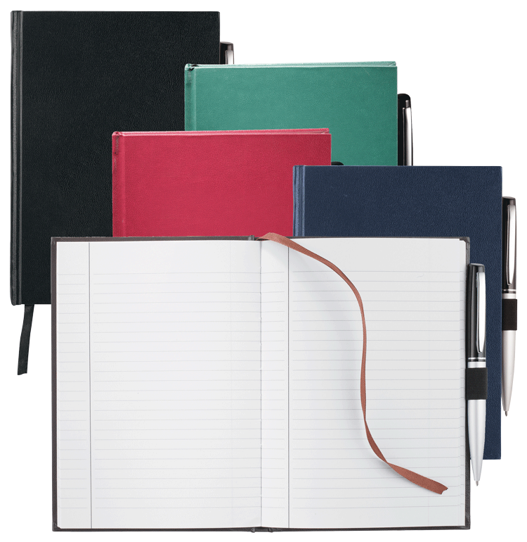 70 sheets of spiral-bound lined paper. Built-in elastic pen loop (pen not included). Elastic closure. Important contacts page and three-year calendar. 10" x 7 3/4" x 1/2". Available in black, blue, red, gray and natural.